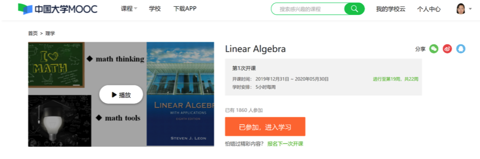 1.Linear Algebra(线性代数)国际爱课程平台课程链接,可进入课程介绍页,参加学习:https://www.icourse163.org/en/mooc/course/NPU1-1458030173