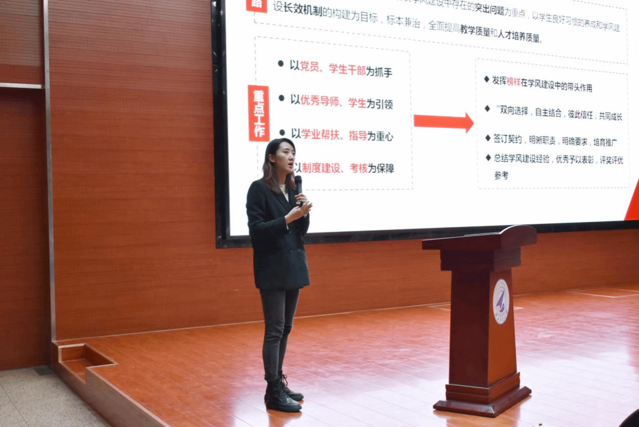 围绕如何加强学风建设,公司专业课教师代表于美、班主任代表王晓龙、宿舍导师团导师代表钮鹏程、本科生模范班级班长孔维骏和优秀学风宿舍舍长戴景文依次进行主题发言。