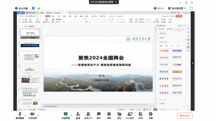 为全面贯彻党的二十大精神,推动学习贯彻习近平新时代中国特色社会主义思想入脑入心,进一步学习2024年全国两会精神,3月27日,威廉体育官方网站特邀公司马克思主义公司蒲瑶教授通过线上形式讲授题为《聚焦2024全国两会——发展新质生产力 增强高质量发展新动能》的专题党课。威廉体育官方网站党委理论学习中心组成员、教职工党员、员工党员代表共80人参加活动。党课由威廉体育官方网站党委书记王莉主持。
