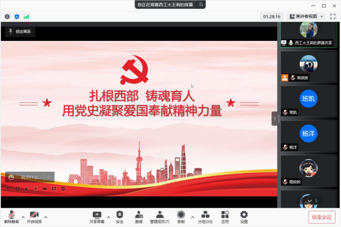 根据前期学习安排,在支部成员充分自学的基础上,南剑波、李淑雯、王霜玥三位同志分别领学了《深入实施新时代人才强国战略,加快建设世界重要人才中心和创新高地》,班凯、程姣姣两位同志领学了《以史为鉴、开创未来、埋头苦干、勇毅前行》。五位同志还就个人的学习体会,近期在公司防控疫情工作中开展的相关工作等进行了分享。