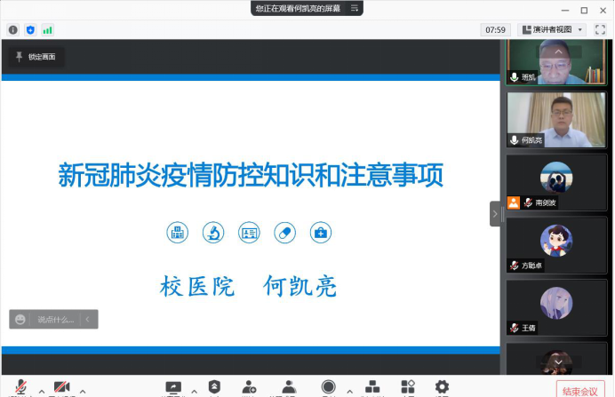 为进一步落实公司疫情防控工作有关文件精神,使公司师生党支部成员在寒假期间都能带头做到科学防控,2022年1月27日,威廉体育官方网站办公室党支部经过前期精心策划,邀请校医院何凯亮副经理通过腾讯会议,面向公司理论中心组全体成员,数学科学系党支部、计算科学系党支部、应用概率统计系党支部以及部分员工党支部全体党员共计82人,在线进行新冠肺炎疫情防控知识的宣讲。