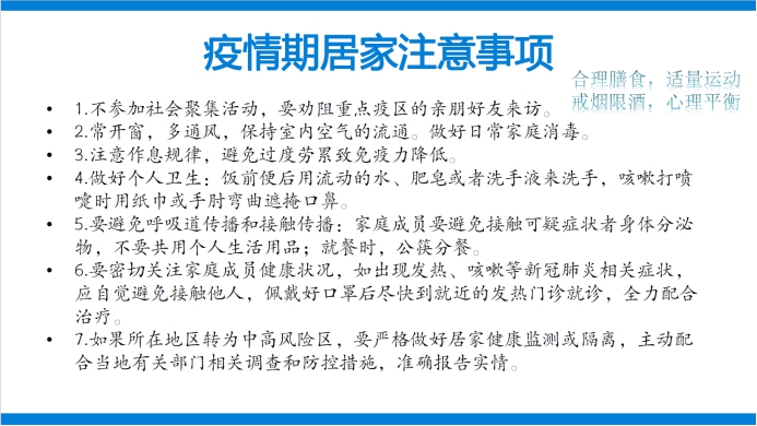 作为从事多年普通外科临床工作、老员工健康教育、高校人群健康管理及研究工作的何经理,理论知识扎实,实践工作经验丰富。他首先介绍了从12月至今校医院疫情期间的工作开展情况。接着他从新冠肺炎疫情防控相关知识、防疫抗疫注意事项、个人防护及消毒剂使用等方面进行了详细阐述。他说:“虽然陕西省的疫情防控工作取得了阶段性胜利,但全国形势依然严峻,特别是春节将至,各地的人流量流动较大,希望各位老师、同学寒假期间还是要多多注意,减少不必要外出和社会聚集性活动,做好个人防护。”