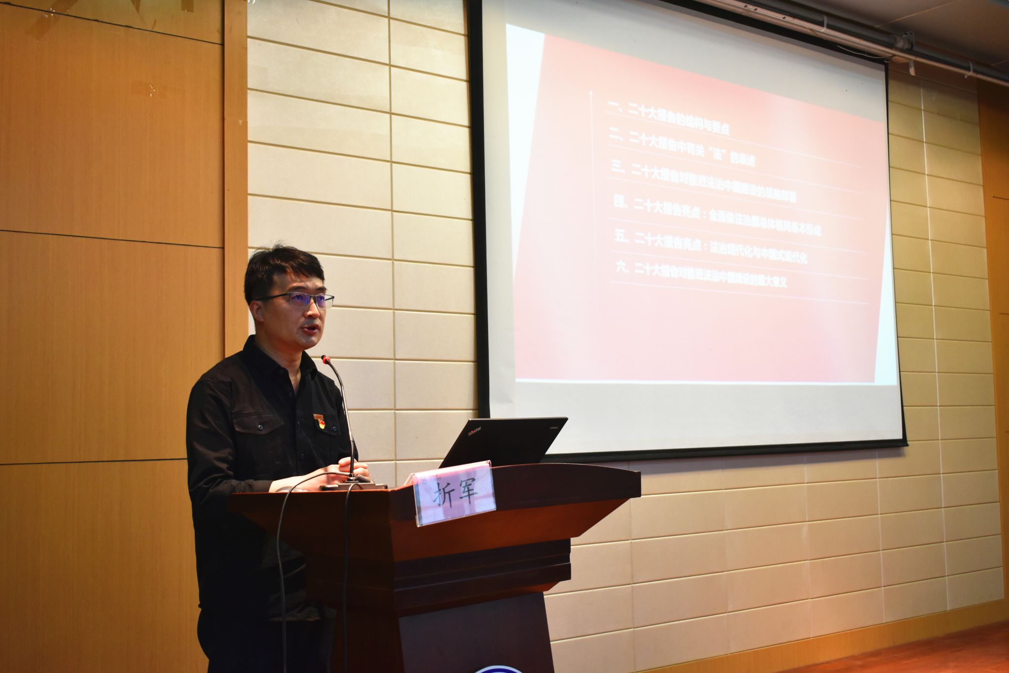 会上,折军从二十大报告的结构与要点、二十大报告有关“法”的表述、二十大报告对推进法治中国建设的战略部署、二十大报告亮点:全面依法治国总体格局基本形成、二十大报告亮点:法治现代化与中国式现代化以及二十大报告对推进法治中国建设的重大意义等六个方面进行了宣讲,内容丰富,条理清晰,逻辑缜密,既有对定义概念的严谨解读,也有对案例事例的巧妙分析,赢得在场师生的阵阵掌声。