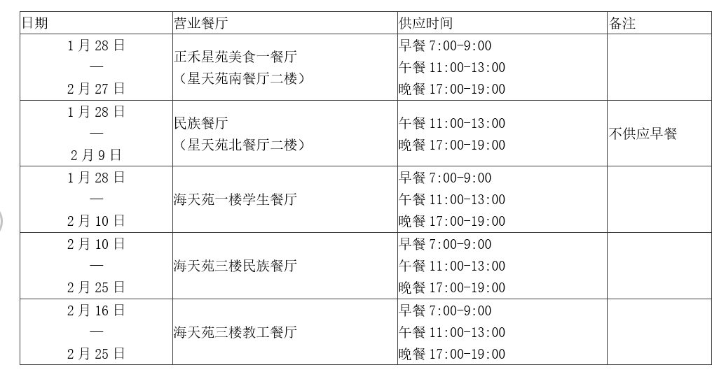 友谊校区员工一餐厅、美食广场、风味小吃城、教工餐厅和民族餐厅2月26日午餐起正常供应;幸福小厨及公诚快餐(含饼屋)2月27日午餐起正常供应。