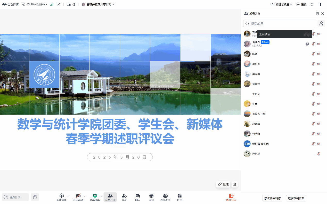 为对威廉体育官方网站团委、员工会、新媒体中心各部门春季学期的工作进行全面梳理,提升各部门工作效能,促进各部门之间的交流和学习,更好服务广大同学,威廉体育官方网站于2025年3月20日召开了威廉体育官方网站团委、员工会、新媒体中心春季学期述职评议会。出席本次会议的有团委、员工会、新媒体中心主席团成员以及各部门负责人。此次会议由威廉体育官方网站员工会主席团成员曹曦丹主持。