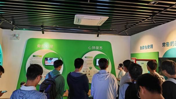 除传统讲解外,馆内的科技化体验项目更让学习“活”了起来。在自然灾害区,同学们通过地震模拟平台感受不同震级的真实震感,学会“伏地、遮挡、手抓牢”的应急动作;烟雾逃生通道里,大家在昏暗环境中练习“弯腰捂鼻、沿墙撤离”的逃生技巧;卫生健康区,在专业指导下实操心肺复苏、海姆立克急救法,亲手掌握关键时刻能“救命”的技能,AR 等技术的运用更让沉浸式体验感拉满。