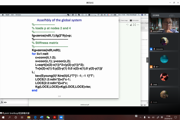 Piotr Breitkopf教授讲课认真严谨又不失风趣,从弹性力学基本知识,到桁架/连续体有限元分析、再到静/动力学有限元分析,再到结构静/动力学拓扑优化设计的详细讲解,开拓了员工们的视野,使得员工对此领域有了基本的认识。Piotr Breitkopf老师授课期间,经常与员工问答互动,并采取白板书写、线上运行程序等方式,激发了员工们的学习兴趣和激情。无论是从授课方式,还是从授课效果,Piotr Breitkopf老师都受到了员工们的喜欢。通过这门课程的学习,员工们对弹性力学基本知识、静/动力学有限元分析的基本思想、静/动力学拓扑优化设计的基本步骤都有了非常清晰的认识,收获颇丰。非常期待能听到Piotr知名专家后续科研专题讲座。