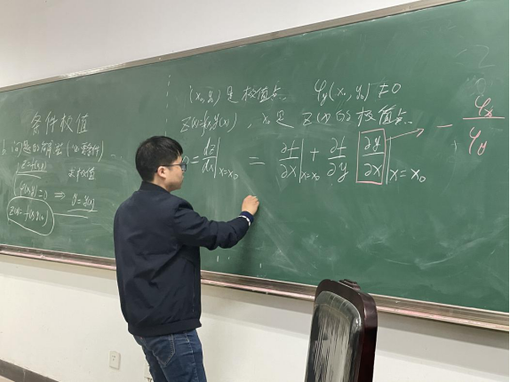 随后,杨佳琦对高等数学中的“条件极值”这一知识点进行了讲解。杨佳琦首先通过简单例子引入条件极值问题,然后推导出了取得条件极值的点满足的必要条件,进而引出了直接求解条件极值的方法——拉格朗日乘数法,最后通过一个例子介绍了如何使用拉格朗日乘数法。各位老师针对杨佳琦的讲解提出了一些意见和建议。彭国华老师指出,在几处知识点的过渡上不够流畅,应加以设计,另外应放慢语速,控制节奏。此外,陆全老师对知识讲授的范畴给出了建议。