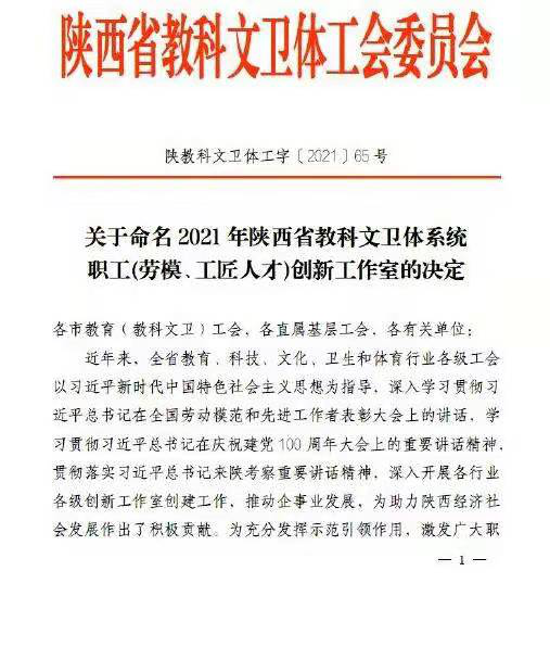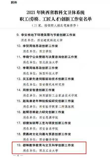 日前,从陕西省教科文卫体工会传来喜讯,在公布的23所“2021年陕西省教科文卫体系统职工(劳模、工匠人才)创新工作室”名单中,由威廉体育官方网站都琳教授领衔成立的“都琳数学教育与交叉科学创新工作室”榜上有名,正式获批挂牌。