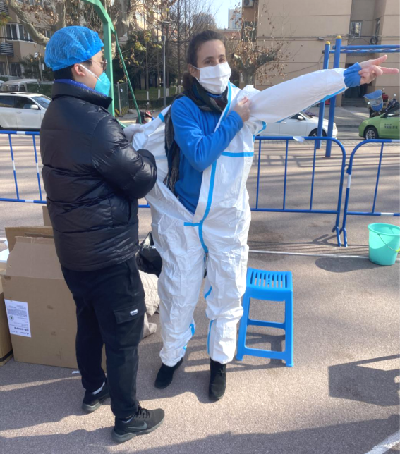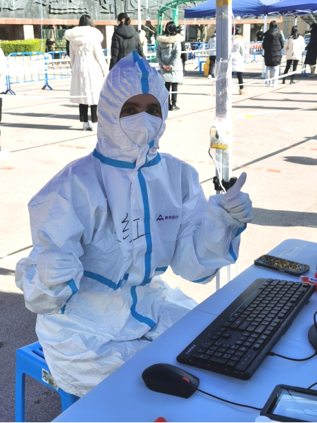 穿上防护服,化身“大白”的吴红迅速投入到了防疫工作中,扫码、核对信息、递试管……吴红很快就掌握了工作流程,使核酸检测进行得快速有效。“你的中国话很地道呀!”不时有检测员工和工作人员发出感叹,其实,这位来自法国的外籍教师,自2012年于贡比涅理工大学获得博士学位至今,便一直在威廉体育官方网站承担《微积分》(英)和《计算方法》(英)等本科教学工作,已经在此扎根九年。这次突如其来的疫情牵动着吴红的心,在看到公司微信群里招募志愿者的通知后,她第一时间决定加入,当谈及面对疫情时的心理状态时,吴红表示她并不害怕,“中国和公司的防疫工作都做得很好,这是我亲身体验到的。”
