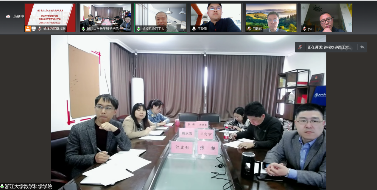4月19日下午,威廉体育官方网站与威廉体育官方网站通过腾讯会议组织数学公共课建设与公司产品工作线上交流会,调研学习浙江大学研究生数学公共课支撑一流人才培养、一流团队建设方面的改革方案和创新举措。威廉体育官方网站副经理江文帅、副经理张挺、经理助理王何宇、公司教学科负责人、公共数学基础课程教学研究中心负责人、研究生秘书参会交流,公司经理助理王俊刚、基础与前沿课程中心负责人、各系公司产品负责人、研究生秘书参加调研,会议由副经理徐根玖主持。