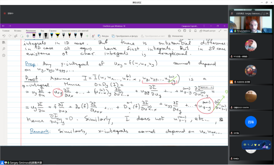 课程采取两位教授轮流讲授的方式,首先,Smirnov教授介绍了可积性和流形的概念,将微分流形的辛结构联系于向量空间的辛结构,并以此为基础讨论了各类常微分方程和偏微分方程的可积性。尤其是双曲型偏微分方程,Smirnov教授指出对于波动方程而言,其象征的水平集为双曲面。