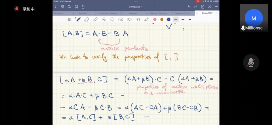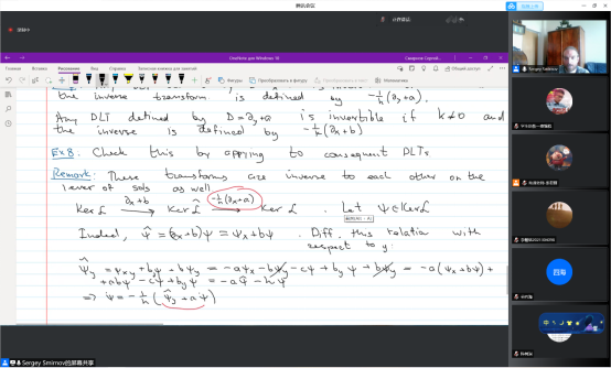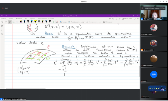 2022年6月27日至7月9日,威廉体育官方网站举办的暑期国际讲堂《李代数与可积双曲方程》通过腾讯会议APP圆满完成授课。该课程由莫斯科国立大学教授Dmitry V Millionshchikov(Millionshchikov是代数拓扑学及其应用、微分几何和幂零李代数理论及其应用等领域的知名专家。他还是莫斯科国立大学罗蒙诺索夫分校高等几何学和拓扑学系的副主任)和Sergey V. Smirnov(Smirnov曾多次在北京大学,密歇根州立大学,莫斯科独立大学做讲座)讲授。来自数学、机电及伦敦玛丽女王等公司的本科生、博士生及旁听生参加了该课程。