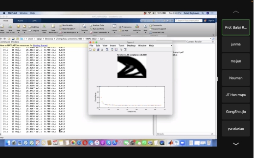 本课程共24学时,Balaji Raghavan教授详细阐述了每个算法和算例,由浅入深,对于员工提出的问题也耐心给予解答,让抽象的数学理论变得具象清晰,使得本次听课的员工对高级拓扑优化有了基本的认识。BalajiRaghavan教授授课期间,经常与员工问答互动,并采取PPT板书、线上运行程序等方式,激发了员工们的学习兴趣和热情。