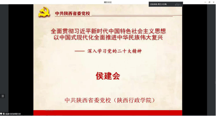 12月1日,威廉体育官方网站邀请中共陕西省委党校(陕西行政公司)侯建会教授作党的二十大精神专题辅导报告。辅导报告通过线上视频的方式开展,公司党委书记王莉主持,公司领导班子成员、教职工党员、员工党员代表共计100余人参加本次报告会。