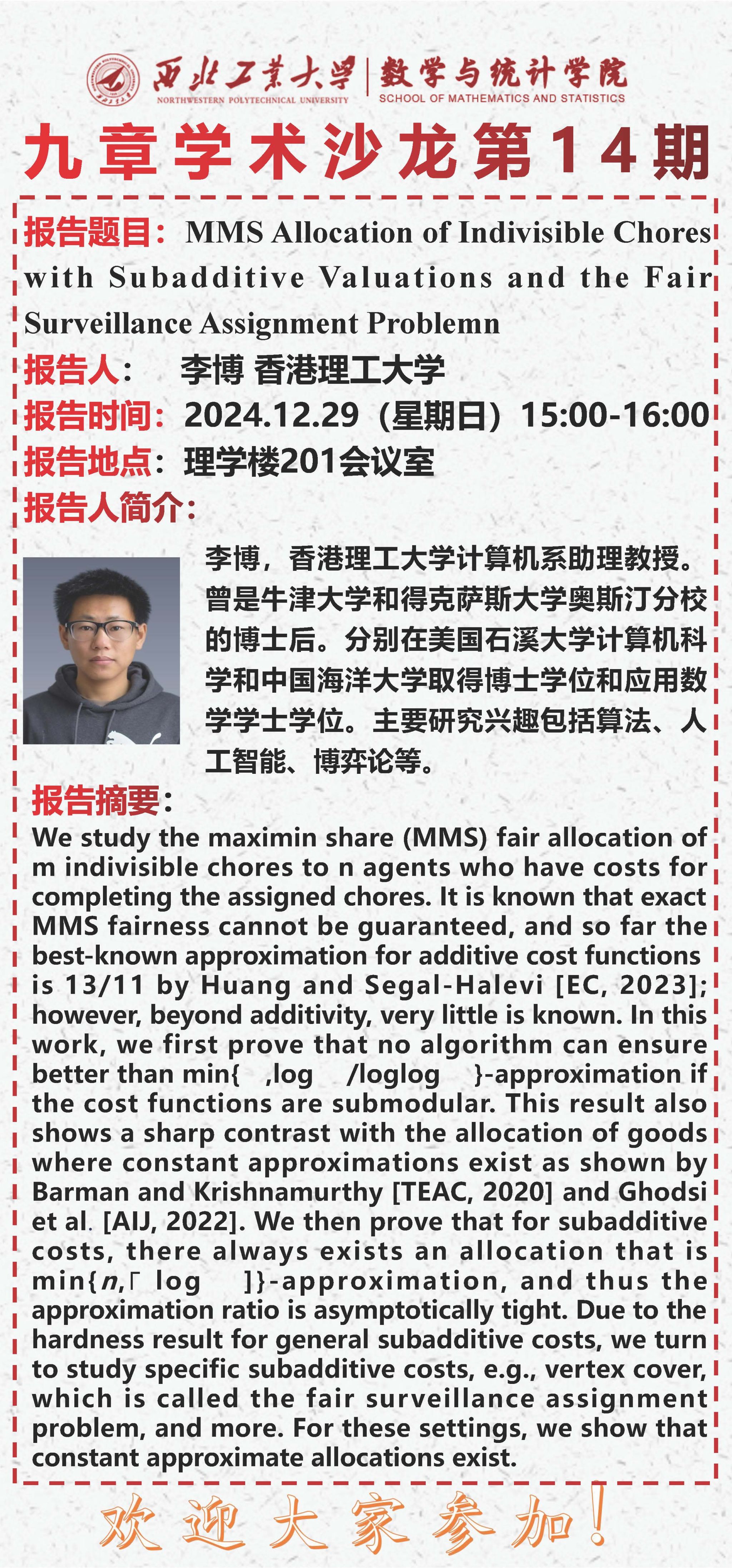 【九章学术沙龙第14期】MMS Allocation of Indivisible Chores with Subadditive Valuations and the Fair Surveillance Assignment Problemn