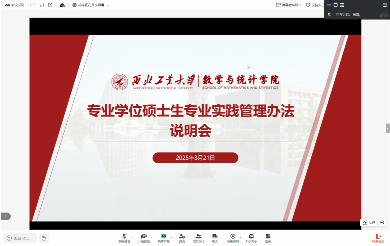 会上,研究生教学秘书杨洋围绕学术规范、实践形式与要求、校外实践安全规范及考核标准等关键环节系统解读了公司《专业学位硕士研究生实践管理办法》。