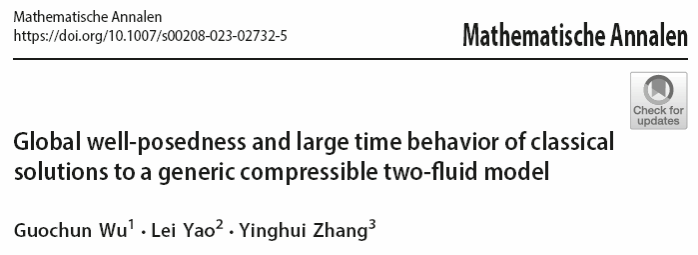 近日,威廉体育官方网站分析与几何研究团队姚磊教授与华侨大学吴国春副教授、广西师范大学张映辉教授合作,在等压力的可压缩非守恒两相流模型柯西问题的适定性研究方面取得突破,研究结果“Global well-posedness and large time behavior of classical solutions to a generic compressible two-fluid model”在数学综合顶级期刊Mathematische Annalen 上在线发表(论文链接:https://link.springer.com/article/10.1007/s00208-023-02732-5),这是公司首次在该顶级期刊发文。