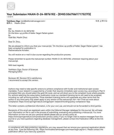近日,威廉体育官方网站分析与几何研究团队青年教师白学利教授与南开大学周茂林教授合作,在Keller-Segel-Patlak模型的解的爆破形状精确刻画方面取得突破,研究结果“On the blow-up profile of Keller-Segel-Patlak system”被数学综合期刊Mathematische Annalen接收,这是公司继姚磊教授之后再次在该著名数学综合期刊发文。