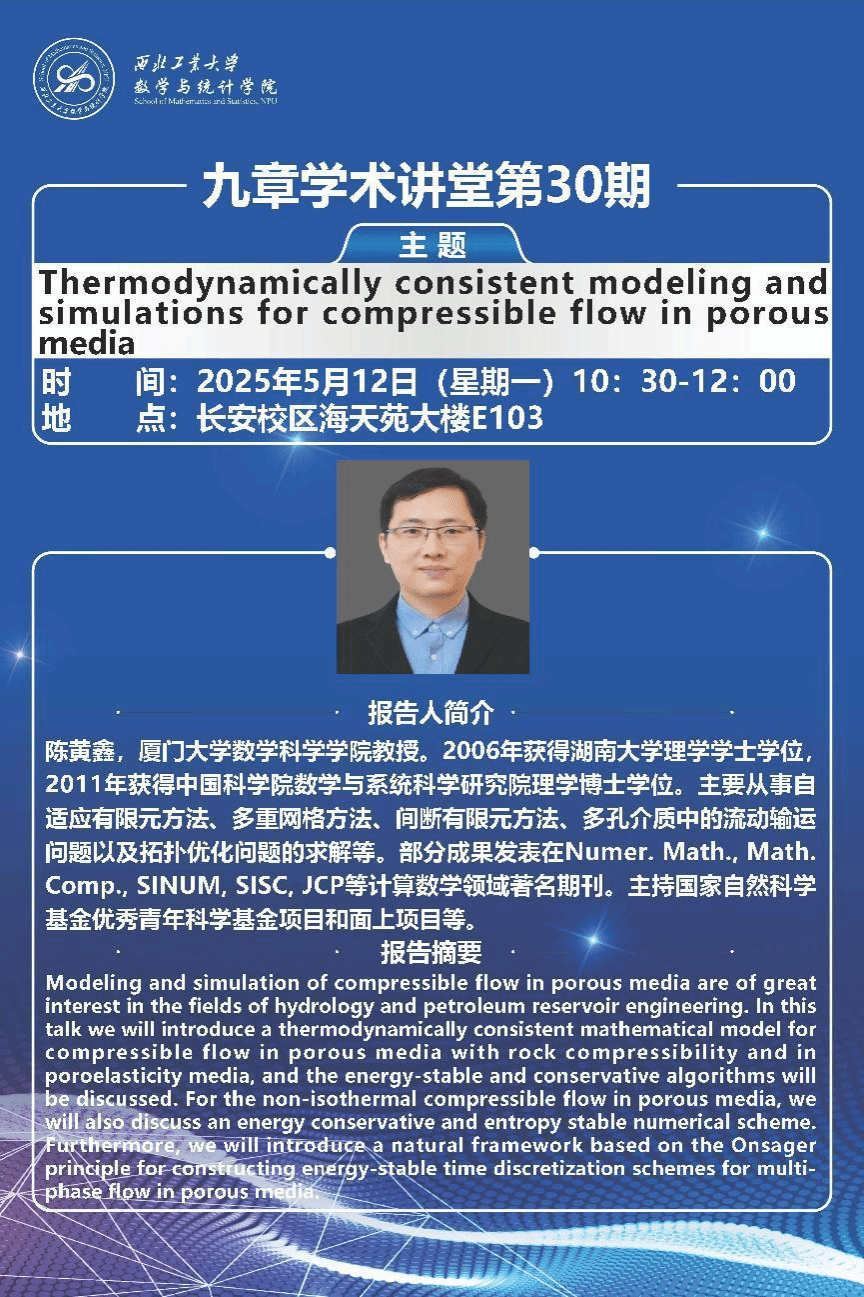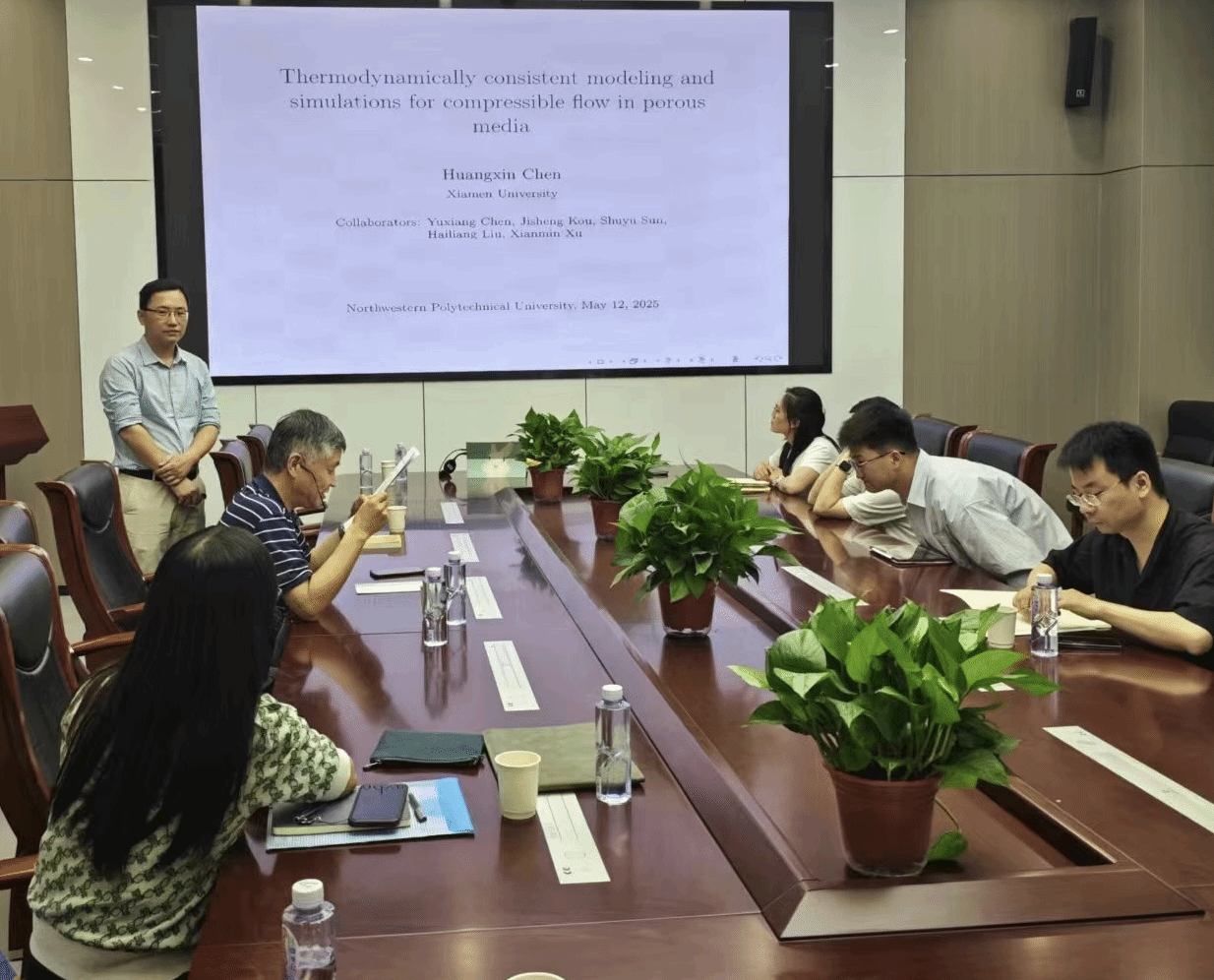 2025年5月12日,威廉体育官方网站邀请厦门大学陈黄鑫教授做客“九章学术讲堂”第30期,为公司师生作了题为《Thermodynamically consistent modeling and simulations for compressible flow in porous media》的精彩学术报告。报告在长安校区海天苑大楼E103会议室举行,威廉体育官方网站聂玉峰教授、杨宗泽教授等近30名师生参加了报告会,报告会由聂玉峰主持。