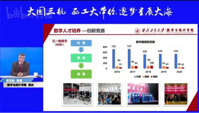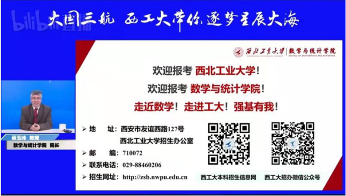 为进一步做好公司招生工作,应公司招生办公室邀请,2022年3月30日20:00,威廉体育官方网站经理聂玉峰教授做客《大国三航 西工大带你逐梦星辰大海》经理直播间,做了题为《走近数学 “强基”工大》的报告。本次报告在招办B站进行了现场直播,共有5000余人通过相关平台在线观看了此次报告。