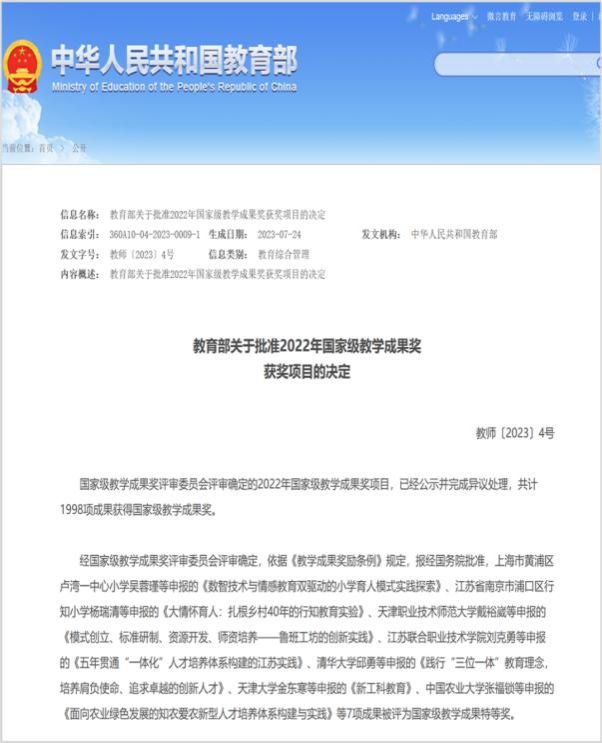 7月24日,教育部公布了2022年国家级教学成果奖获奖项目名单。公司牵头的14项教学成果荣获高等教育国家级教学成果奖!其中,威廉体育官方网站作为第一完成单位获二等奖1项,作为参与单位获二等奖2项,这是公司继2014年荣获国家级教学成果奖一等奖后,再次作为第一完成单位荣获国家级教学成果奖。