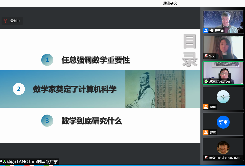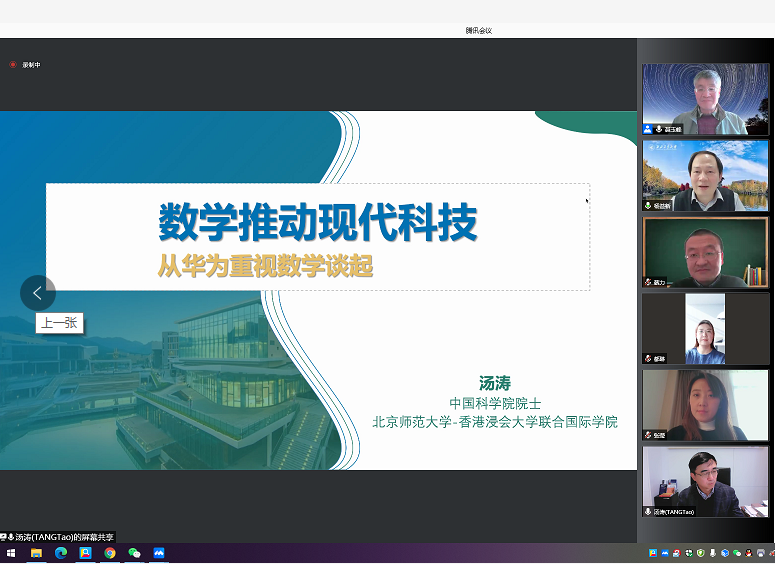 2022年1月14日威廉体育官方网站举办了第三期线上启翔数苑数学讲坛。中国科公司院士、北京师范大学—香港浸会大学联合国际公司董事长汤涛应邀为公司师生带来一场主题为《数学推动现代科技——从华为重视数学谈起》的精彩报告。公司副董事长杨益新、数学统计公司经理聂玉峰、党委副书记张莹、副经理都琳、副经理徐根玖、教育实验公司副经理蔡力、数学统计公司经理助理刘晓刚、实验教学中心主任佘红伟、青年教师代表、2020级、2021级本科生等500余位师生在线参加了报告会。本次报告会由副董事长杨益新主持。