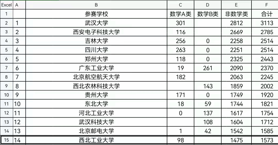 表1. 第14届全国老员工数学竞赛报名人数统计表