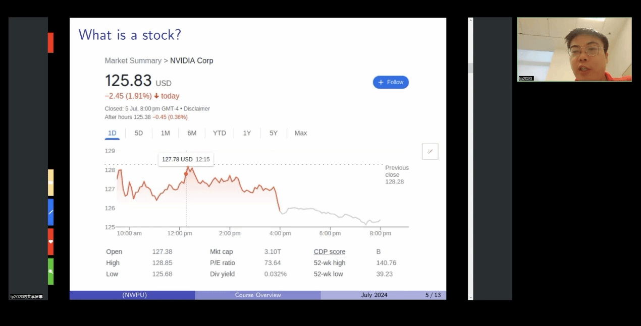 本课程的主题是利用数学工具来建立金融市场模型和解决金融问题。童老师首先从英伟达的股票价格讲起,让大家对一系列金融问题以及概率论中的概念有了初步印象,同时提出的一些问题引发了同学们的激烈讨论,加深了同学们对金融市场的理解。