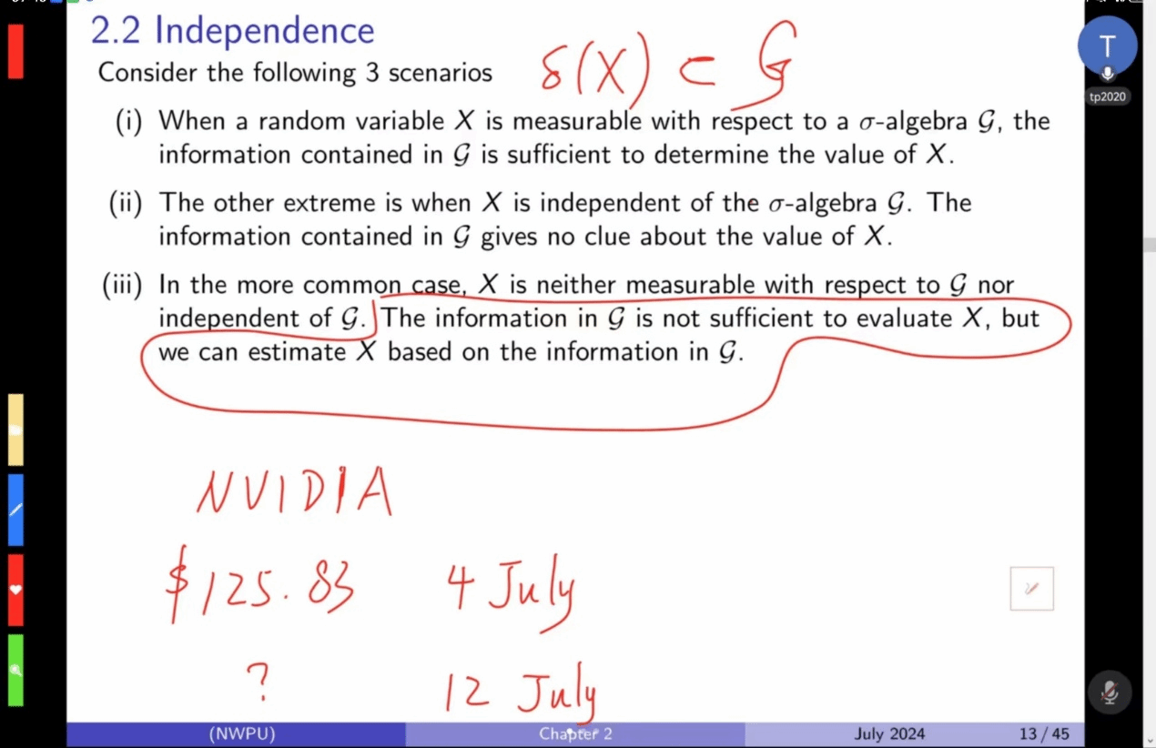 童老师接着开始对广义概率论的理论部分进行详细的介绍与解释,从无穷概率空间,随机变量和分布到期望以及期望的计算等,系统而清晰地帮助大家建立起这门课的框架,并且在讲授课程中,继续围绕英伟达的股票价格这个例子,同时借助板书写下关键信息来帮助大家理解概念。