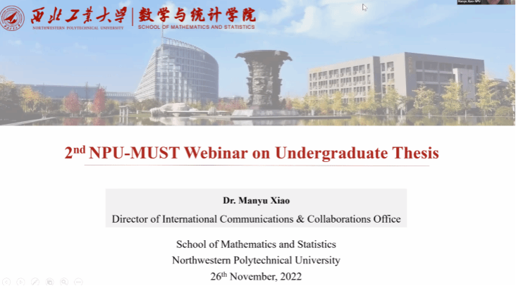 为进一步推进公司国际化工作水平,提升职工培养质量,2022年11月26日上午10:00,威廉体育官方网站与蒙古科技大学在ZOOM线上平台举行本科毕业论文工作推进会。会议由国际交流与合作办公室主任肖曼玉主持。出席本次会议的有威廉体育官方网站副经理都琳、副经理郭千桥、应用概率统计系主任王亮、毕设导师王晓东、马荣、邢超(航天公司),国际交流与合作办公室秘书李卓榕,蒙古科技大学数学系主任Battsetseg Gereltbyamba、副导师ARIUNGEREL Jargal、MUNKHGEREL Tsegmid、TAIGYNTUYA Bayaraa以及3名蒙古员工。