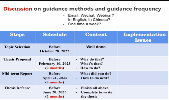 肖曼玉老师首先对蒙古员工的毕业选题情况作了简单介绍,并表示公司以及公司高度重视本科职工的毕业论文工作,从论文选题、开题、中期考核、答辩,对导师和员工都有严格的阶段性要求。接下来双边导师分别从学术背景、研究方向和科研成果等方面做了自我介绍,并对员工提出了自己的指导要求。应用概率统计系主任王亮老师强调,员工和双边导师要注重指导过程中的交流和反馈,这是成功完成毕设的必要条件,离不开双方的共同努力。蒙古员工如在其中遇到任何困难,可随时联系中国导师或中国员工。最后,双方导师就毕业论文的指导方式和指导频率展开了具体讨论。