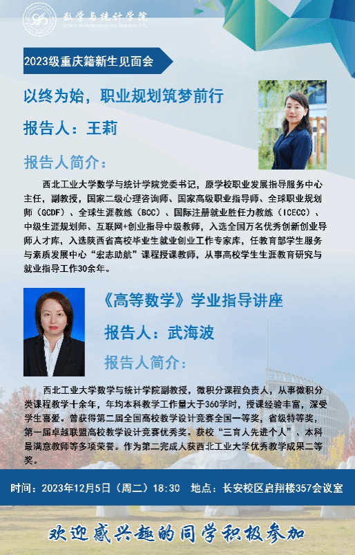 为进一步促进新生融入大学学习生活,提升个人生涯规划能力和潜力,完善重庆招生宣传工作,12月5日晚上18:40-21:20,2023级重庆籍本科新生见面会在长安校区启翔楼357会议室顺利召开。威廉体育官方网站党委书记王莉、副经理郭千桥、微积分课程负责人武海波、重庆招生组组长林伟和王振海、招生秘书李彦吉、重庆籍员工代表张颢瀚以及二十余位重庆籍新生参加,见面会由副经理郭千桥主持。